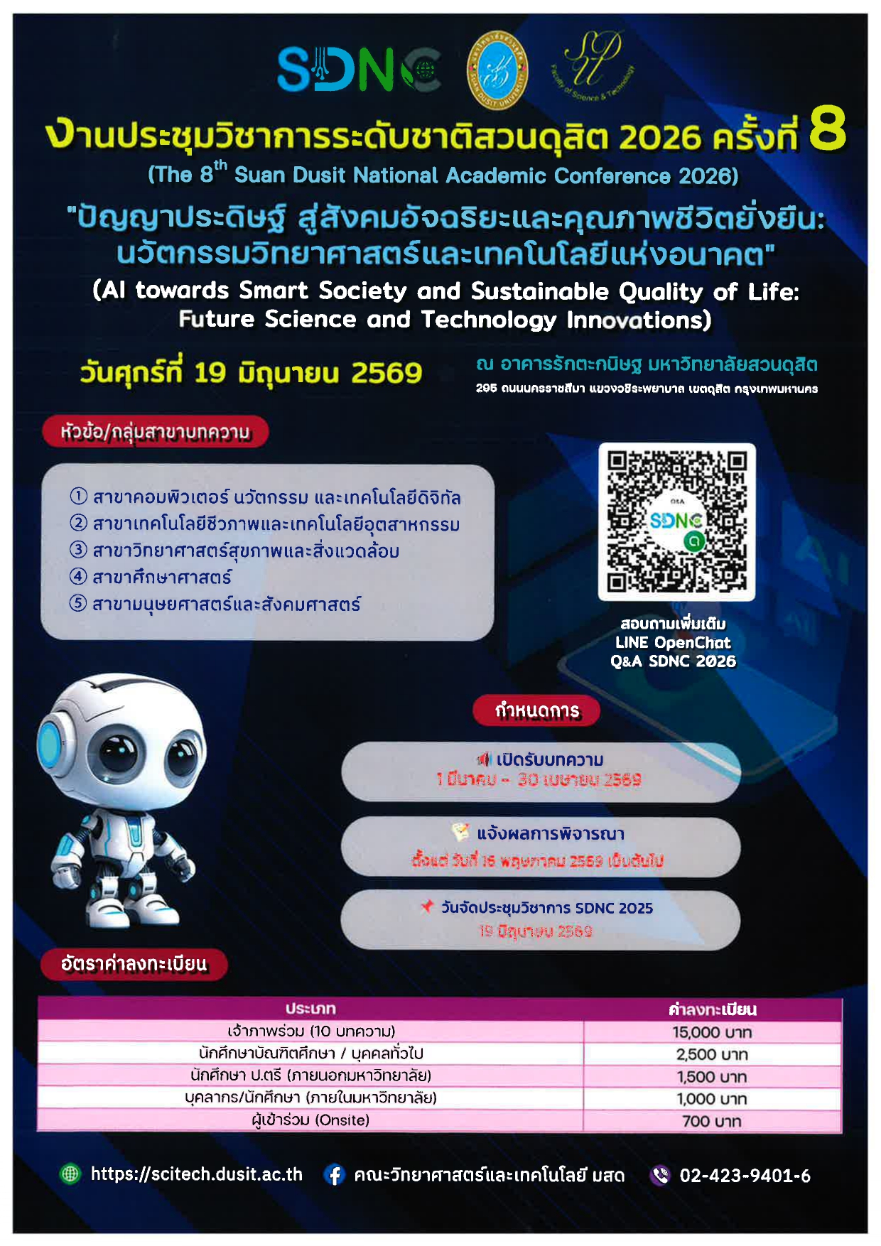 ขอเรียนเชิญเข้าร่วมและประชาสัมพันธ์การประชุมวิชาการระดับชาติสวนดุสิต 2026 ครั้งที่ 8