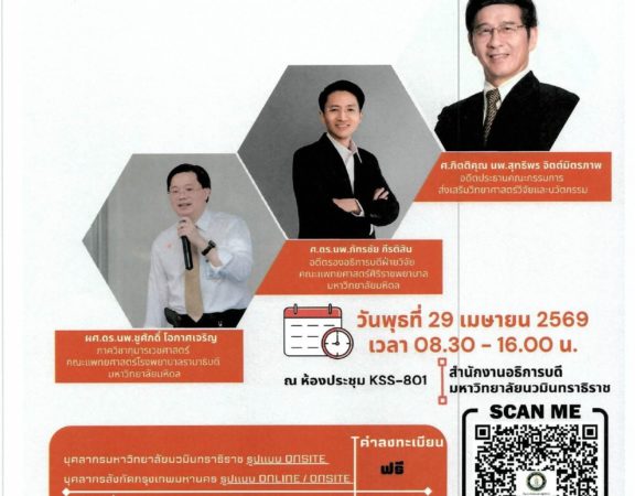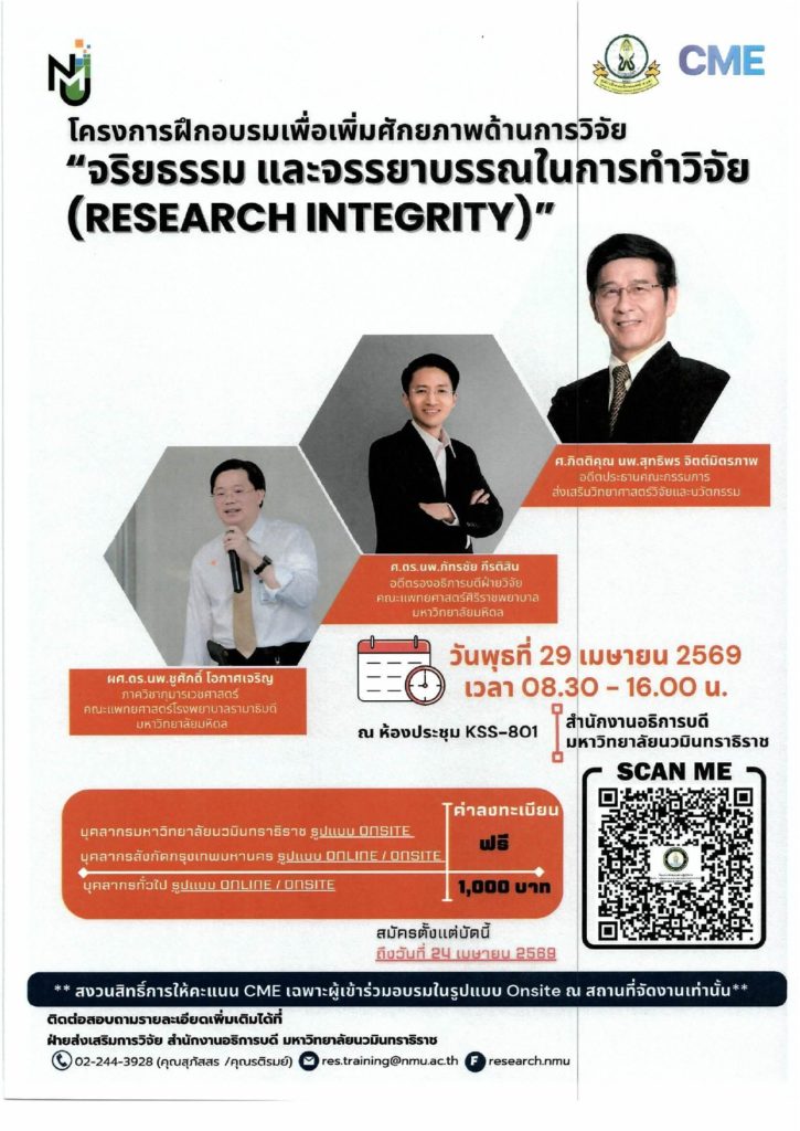 ขอประชาสัมพันธ์โครงการฝึกอบรมเพื่อเพิ่มศักยภาพด้านการวิจัย ประจำปีงบประมาณ พ.ศ. 2569 หัวข้อ “จริยธรรมและจรรยาบรรณในการทำวิจัย (Research Integrity)”