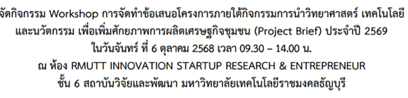 ขอเชิญชวนอาจารย์/นักวิจัย เข้าร่วมการจัดกิจกรรม Workshop การจัดทำข้อเสนอโครงการภายใต้กิจกรรมการนำวิทยาศาสตร์ เทคโนโลยีและนวัตกรรม เพื่อเพิ่มศักยภาพการผลิตเศรษฐกิจชุมชน (Project Brief) ประจำปี 2569