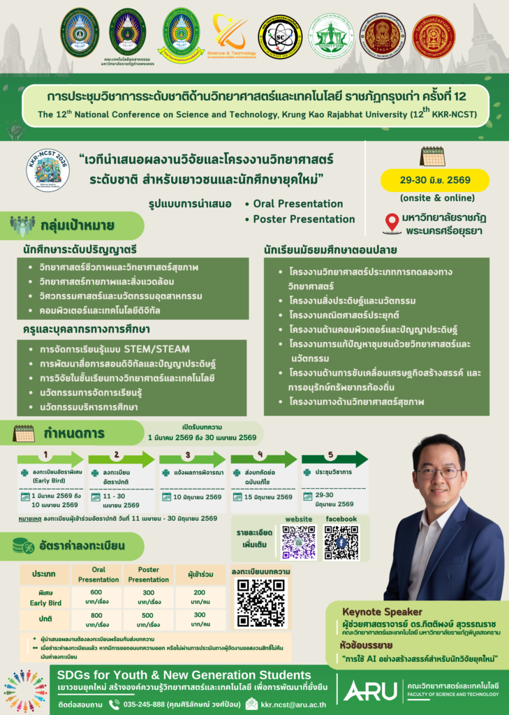 ขอเรียนเชิญเข้าร่วมนำเสนอผลงานวิจัยในการประชุมวิชาการระดับชาติด้านวิทยาศาสตร์และเทคโนโลยีราชภัฏกรุงเก่า ครั้งที่ 12