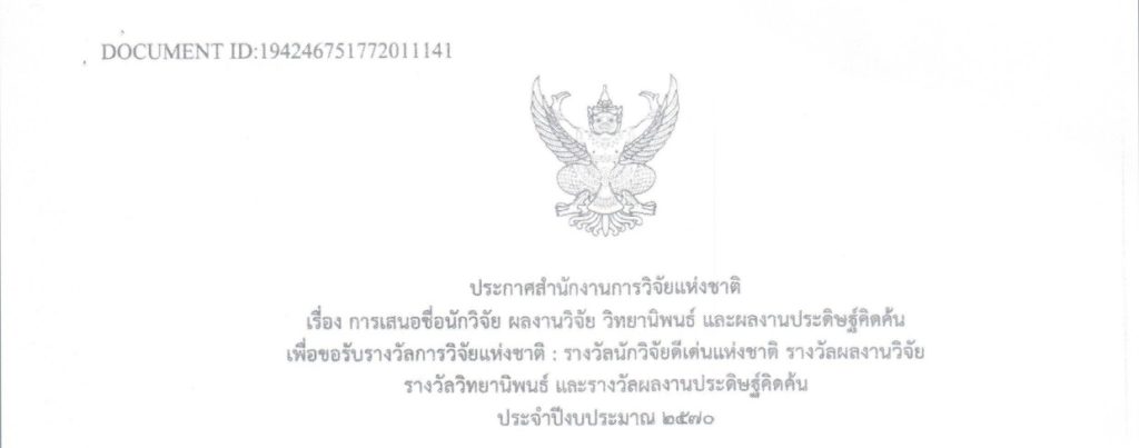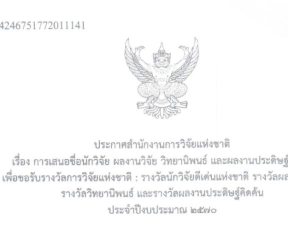 ขอเชิญเสนอผลงานเพื่อขอรับรางวัลการวิจัยแห่งชาติ:รางวัลนักวิจัยดีเด่นแห่งชาติ รางวัลผลงานวิจัย รางวัลวิทยานิพนธ์ และรางวัลผลงานประดิษฐ์คิดค้น ประจำปีงบประมาณ 2570