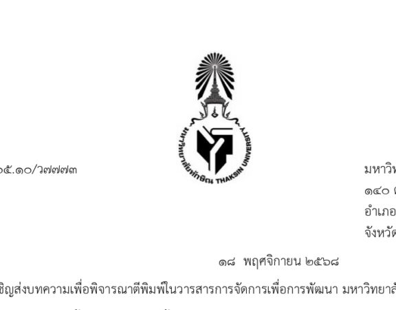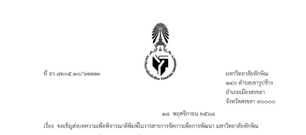 ขอเชิญส่งบทความเพื่อพิจารณาตีพิมพ์ในวารสารการจัดการเพื่อการพัฒนา มหาวิทยาลัยทักษิณ