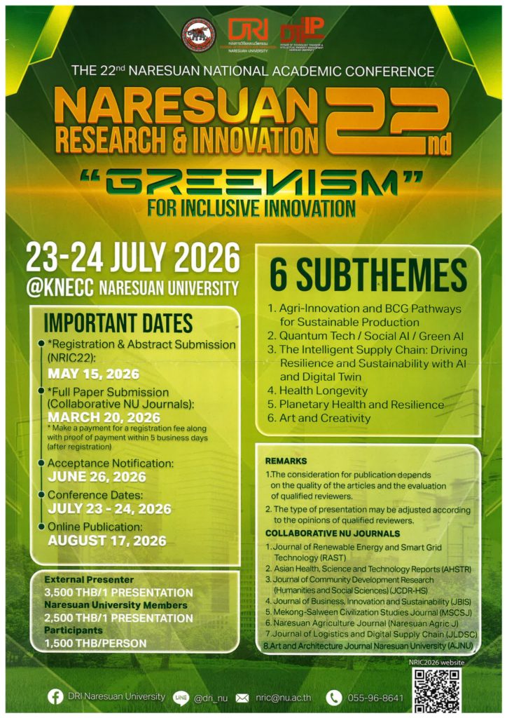 ขอเชิญส่งผลงานเข้าร่วมนำเสนอการประชุมวิชาการระดับชาตินเรศวรวิจัยและนวัตกรรม ครั้งที่ 22 Greenism for inclusive innovation