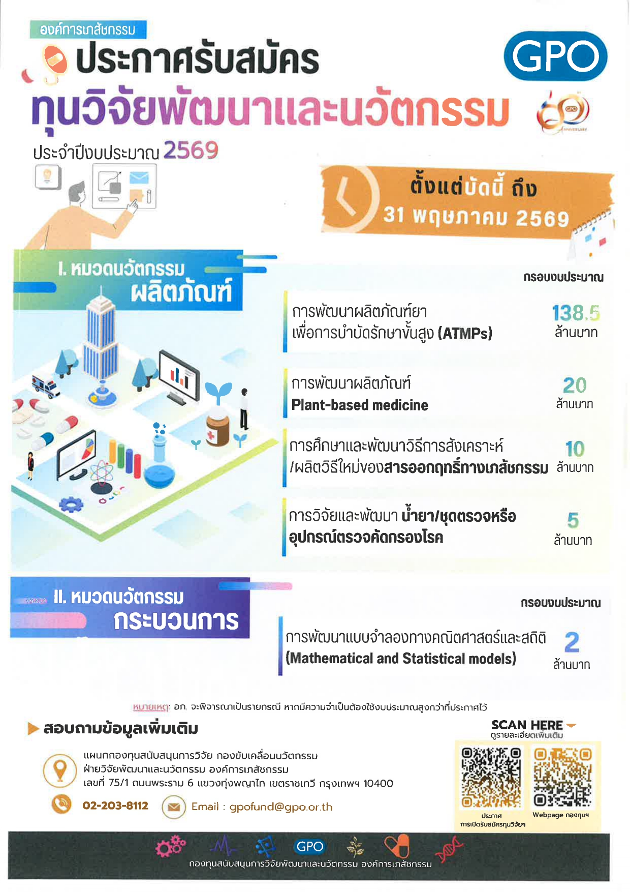 องค์การเภสัชกรรม ขอความอนุเคราะห์หน่วยงานของท่านประชาสัมพันธ์ผู้สนใจยื่นแบบเสนอโครงการวิจัย