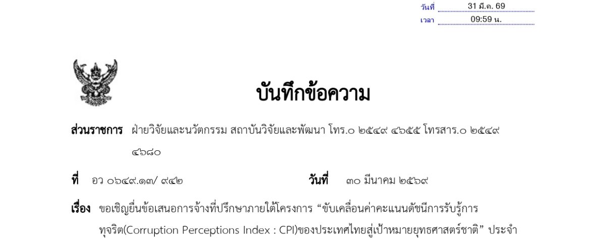ขอเชิญยื่นข้อเสนอการจ้างที่ปรึกษาภายใต้โครงการ “ขับเคลื่อนค่าคะแนนดัชนีการรับรู้การทุจริต(Corruption Perceptions Index : CPI)ของประเทศไทยสู่เป้าหมายยุทธศาสตร์ชาติ” ประจำปีงบประมาณ พ.ศ. ๒๕๖๙ (ครั้งที่ ๒)